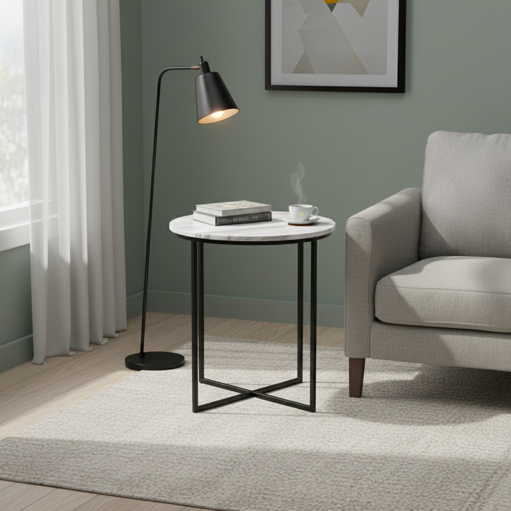 Elevate your living space with the Zovarnyx Modern Round Accent Table, a perfect blend of chic style and practical function. Its elegant white faux marble top and sleek black metal base create a sophisticated statement piece. This versatile side table is ideal for holding your morning coffee, a favorite book, or a stylish lamp next to your sofa or armchair.